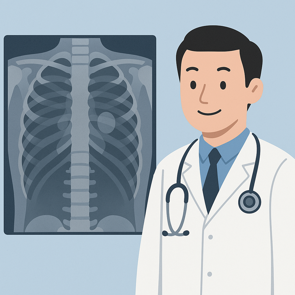 - 흉부 X-ray는 방사선을 이용해 폐, 기관지, 심장, 흉막 등 흉부 구조를 촬영하는 검사입니다.